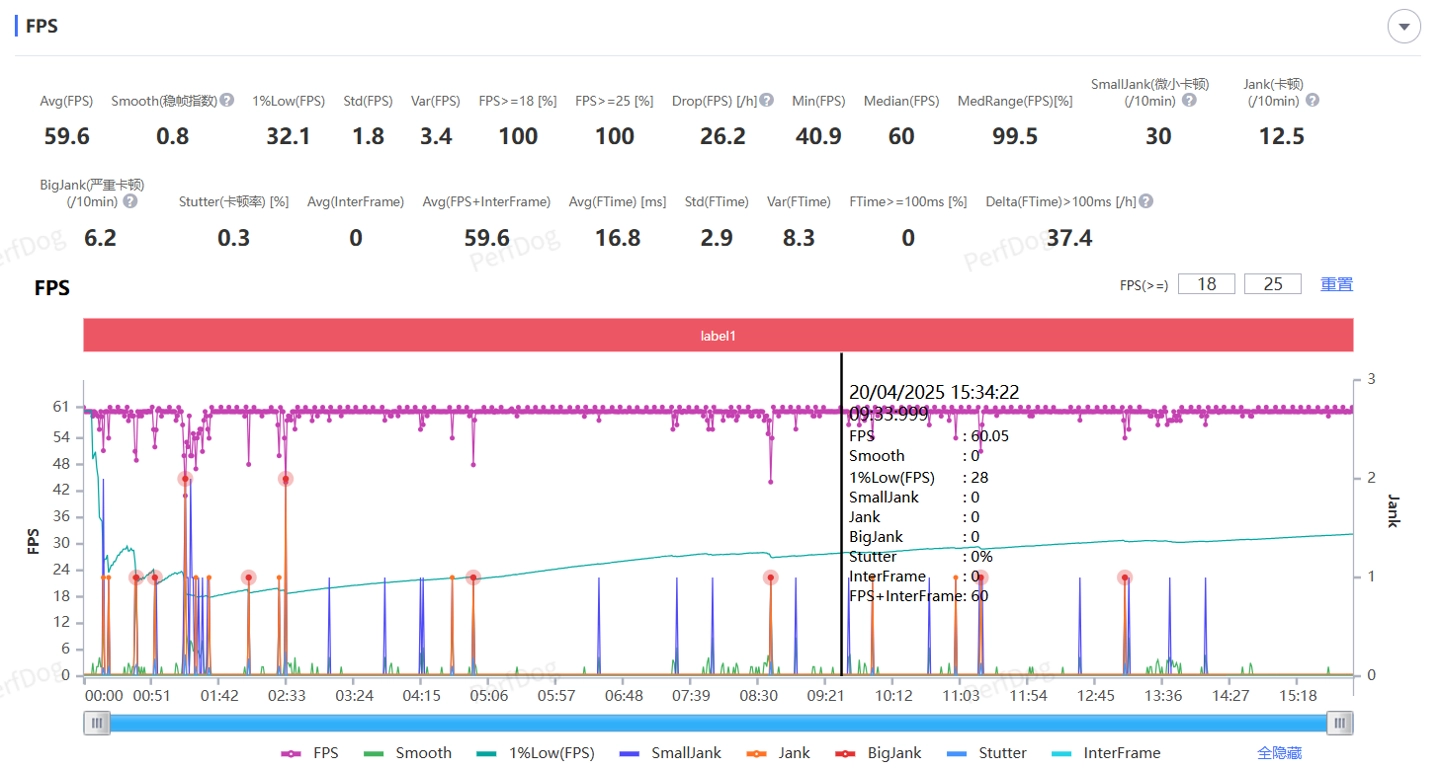 经过 15 分钟的跑图测试,最终游戏平均帧数为 59.6 帧。游戏过程中依旧出现了几次明显波动,不过整体帧率曲线相比《崩坏:星穹铁道》还是要平滑不少。