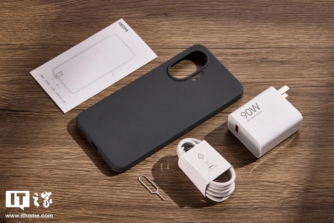 配件方面,REDMI Turbo 4 Pro 随机附赠了一枚黑色硅胶保护套,还有 90W 充电器、数据线、取卡针和说明书等常规配件。