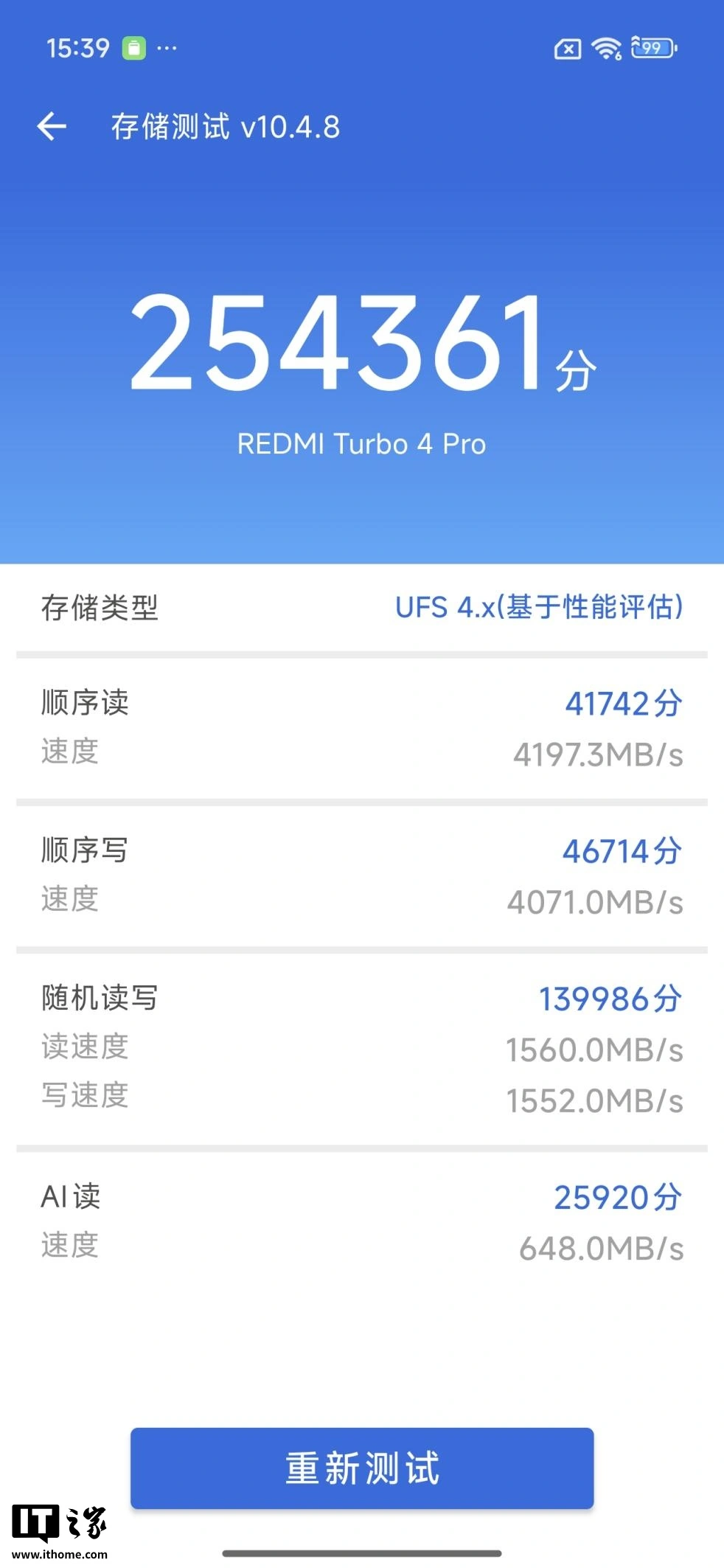 IT之家拿到的这款 Turbo 4 Pro 搭载 16GB 的 LPDDR 5X 内存和 1TB 的 UFS 4.0 存储,使用安兔兔评测进行存储性能测试,得到综合成绩为 254361 分,其中顺序读为 4197.3MB/s,顺序写为 4071.0MB/s,随机读为 1560.0MB/s,随机写入为 1552.0MB/s,AI 读速度为 648.0MB/s。