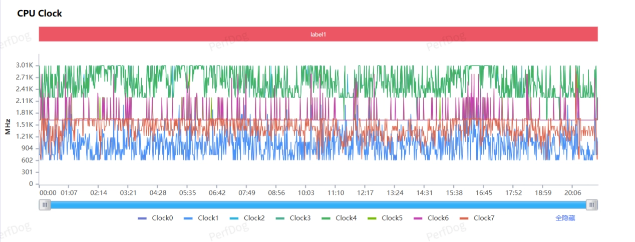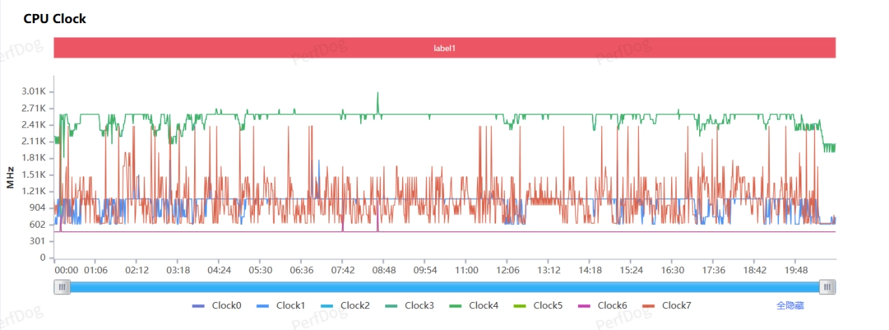 游戏中的平均功耗为 6.7W,其实这个数字也不低了。通过 CPU Clock 实时曲线图可以看到,第四代骁龙 8s 处理器的 3 个 3GHz 大核的频率在游戏中平均维持在 2.8GHz 的水平,使用率均超过 50%,核心调度是比较积极的。