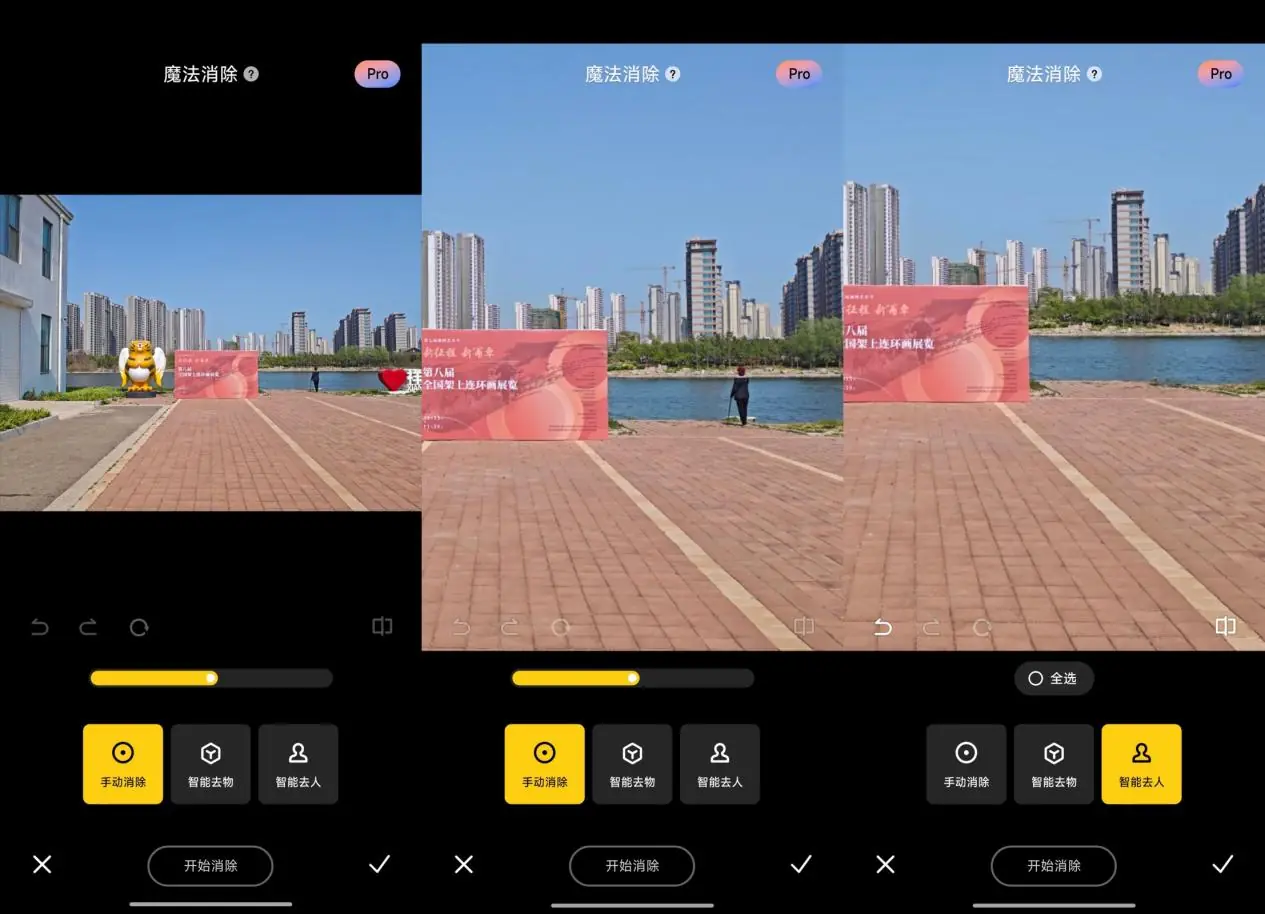 如果你对自己拍出的照片不满意,还可以使用 REDMI Turbo 4 Pro 来进行 AI 辅助修图。比如小编觉得下面这张图片中,河边站着一个人影响了观感,就可以使用相册图片编辑中的魔法消除功能,来把这个人消除掉。使用时,你可以手动消除,也可以让 AI 智能识别人物然后去除。这里小编选的是智能去人,可以看到 Turbo 4 Pro 能准确识别到河边的路人,然后进行消除。路人消除后,Turbo 4 Pro 主动填补了湖面的画面内容,整体看起来还是比较自然的。