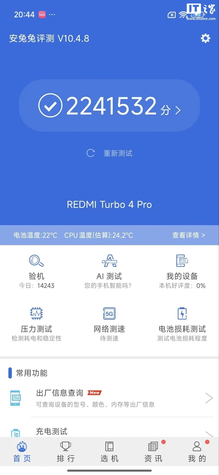 在IT之家的跑分实测中,REDMI Turbo 4 Pro 的安兔兔总分为 2241532 分,这个成绩还是十分亮眼的。