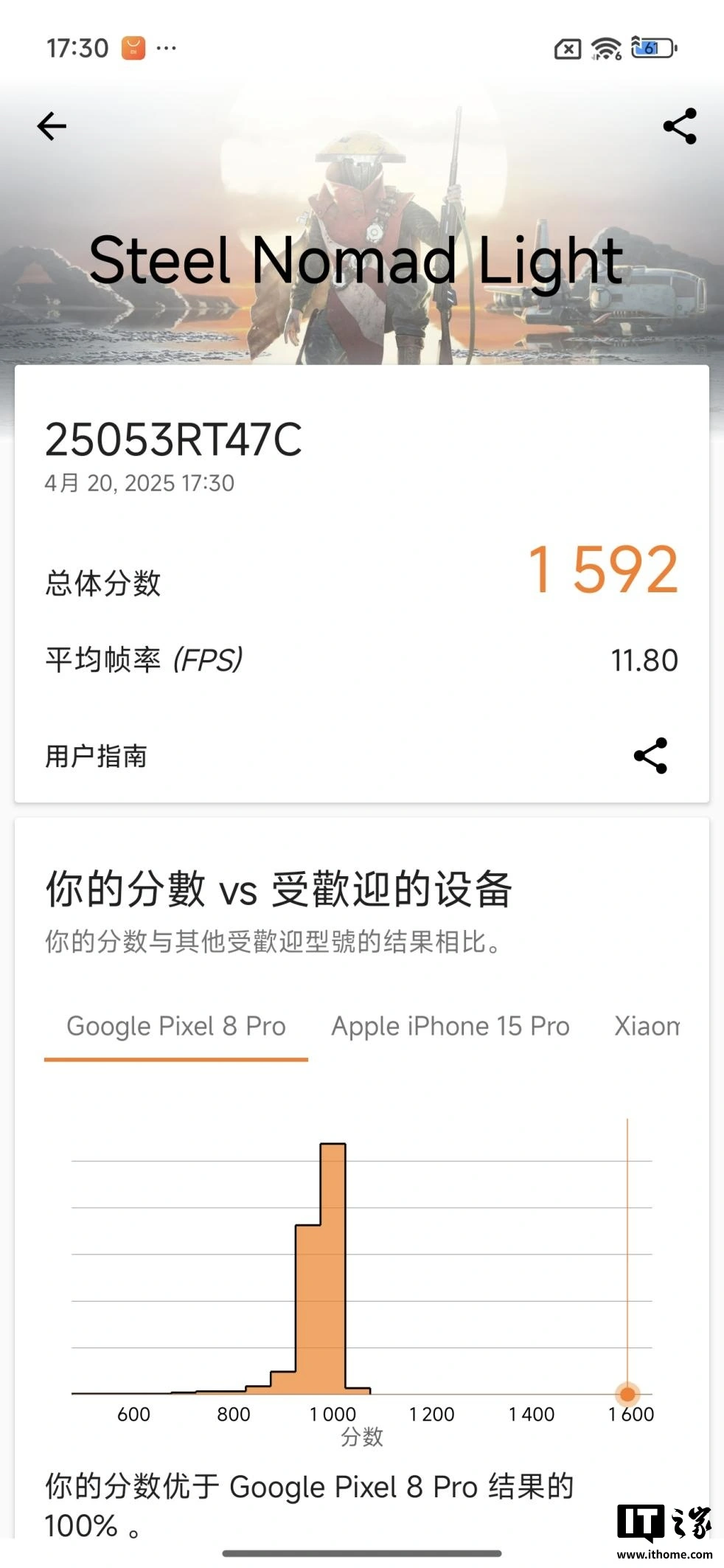 接着小编还使用 3D Mark 测试了 Steel Nomad Light 项目,REDMI Turbo 4 Pro 的总体分数达到 1592 分,平均帧率为 11.80FPS,表现同样不俗。