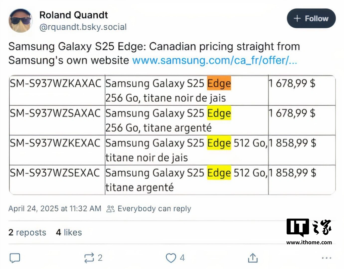 IT之家 4 月 25 日消息,消息源 Roland Quandt 在 Bluesky 平台发布动态,曝料称三星最薄旗舰 Galaxy S25 Edge 手机现身其加拿大官网,256GB 版本起售价为 1679 加元。