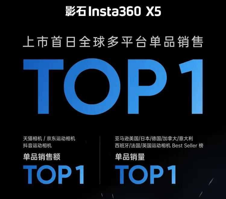 据影石发布的数据显示,X5全景相机上市首日即登上全球多个平台单品销售榜单第一。国内登顶天猫、京东、抖音主流电商平台相机和运动相机单品销售额排行榜,也拿下亚马逊美国、日本、德国、英国等8个国家站点的单品销量第一。