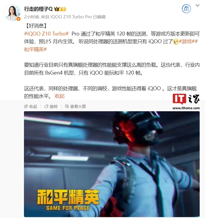 IT之家 4 月 27 日消息,iQOO Z 系列产品经理邢程今日发文称:“iQOO Z10 Turbo Pro 手机通过《和平精英》120 帧送测,,等游戏方版本更新即可体验,预计 5 月内生效。”