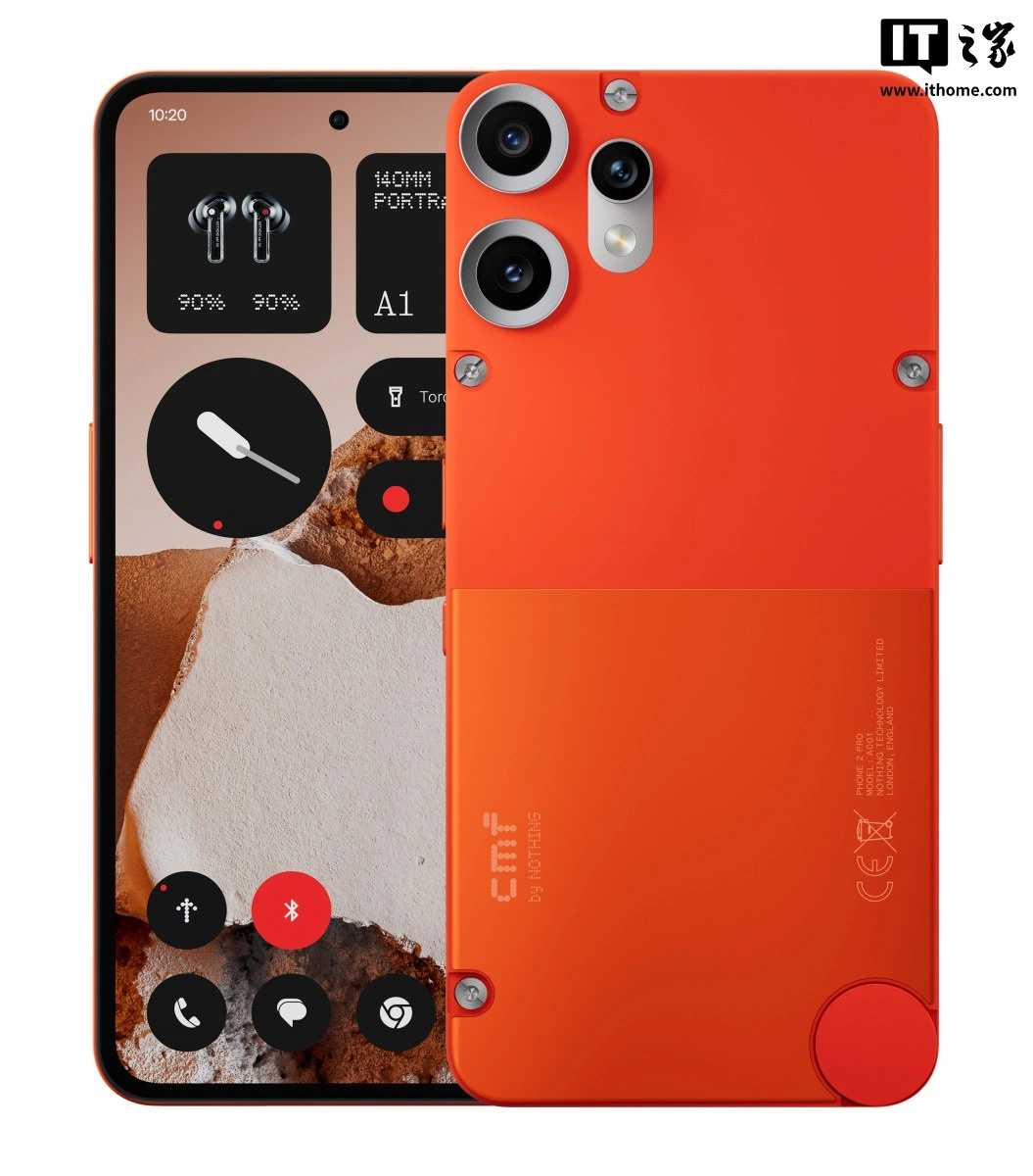 在防护性能方面,Phone 2 Pro 的防水等级从初代的 IP52 提升到了 IP54。手机的厚度为 7.8 毫米,重量为 185 克,相比初代 Phone 1(8.2 毫米厚、197 克重)更加轻薄,而且电池容量保持不变。Phone 2 Pro 提供四种颜色选择:白色(砂岩质感)、黑色和浅绿色(磨砂玻璃质感),以及标志性的橙色(金属光泽)。