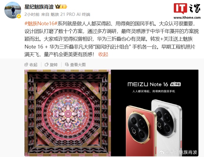 IT之家 4 月 29 日消息,星纪魅族集团中国区总经理 @星纪魅族肖波 今日公布了 Note 16 系列手机的后盖外观,并称,新机最终灵感源于中华千年藻井的方案脱颖而出,华为三折叠也心有灵犀。他还表示“早期工程机照片满天飞,量产机会更美更有质感”。