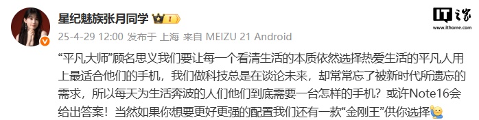星纪魅族产品营销经理 @星纪魅族张月同学 转发了该微博并表示,“‘平凡大师’顾名思义我们要让每一个看清生活的本质依然选择热爱生活的平凡人用上最适合他们的手机,如果你想要更好更强的配置我们还有一款“金刚王”供你选择”。