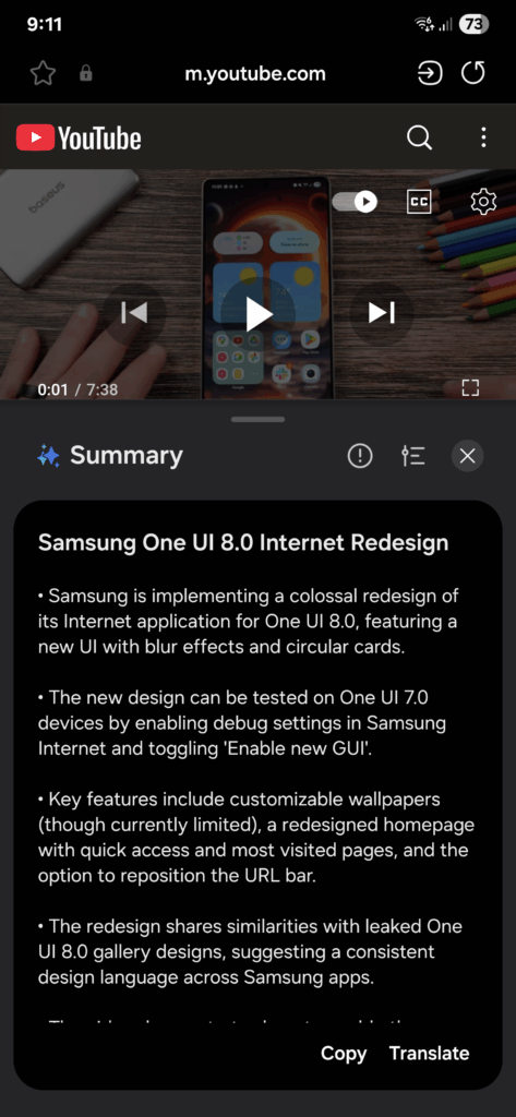 IT之家 4 月 29 日消息,科技媒体 sammyguru 今天(4 月 29 日)发布博文,分享了一段上手测试视频,展示了在基于安卓 16 的 One UI 8 更新系统中,三星浏览器 Samsung Internet 新增的 Galaxy AI 视频摘要新功能。
