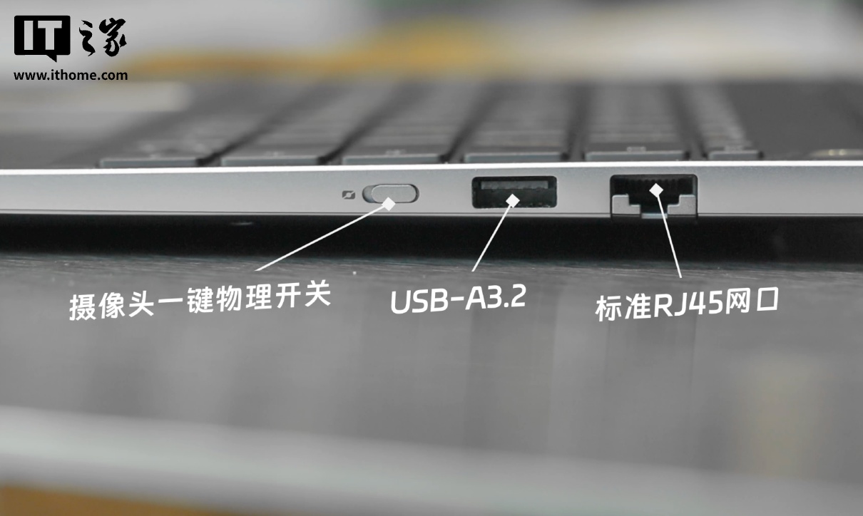 右侧设有 RJ45 以太网口、另一个 USB-A 3.2 接口,并贴心配备摄像头物理开关,可一键切断摄像头连接,守护隐私安全。