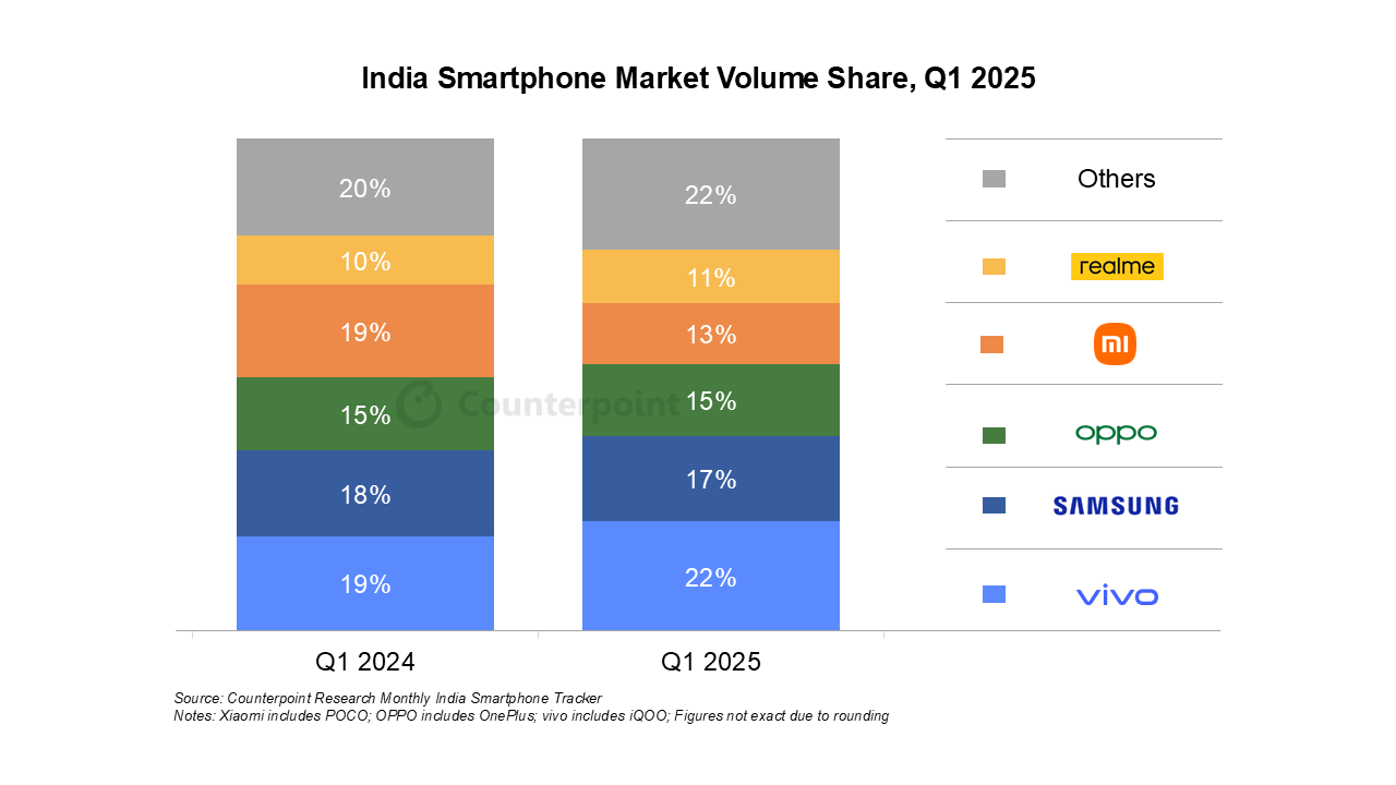 文章来源于互联网:IT之家-CounterPoint 报告 2025Q1 印度手机出货量:vivo 占 22%、三星 17%、OPPO 15%、小米 13%、realme 11%