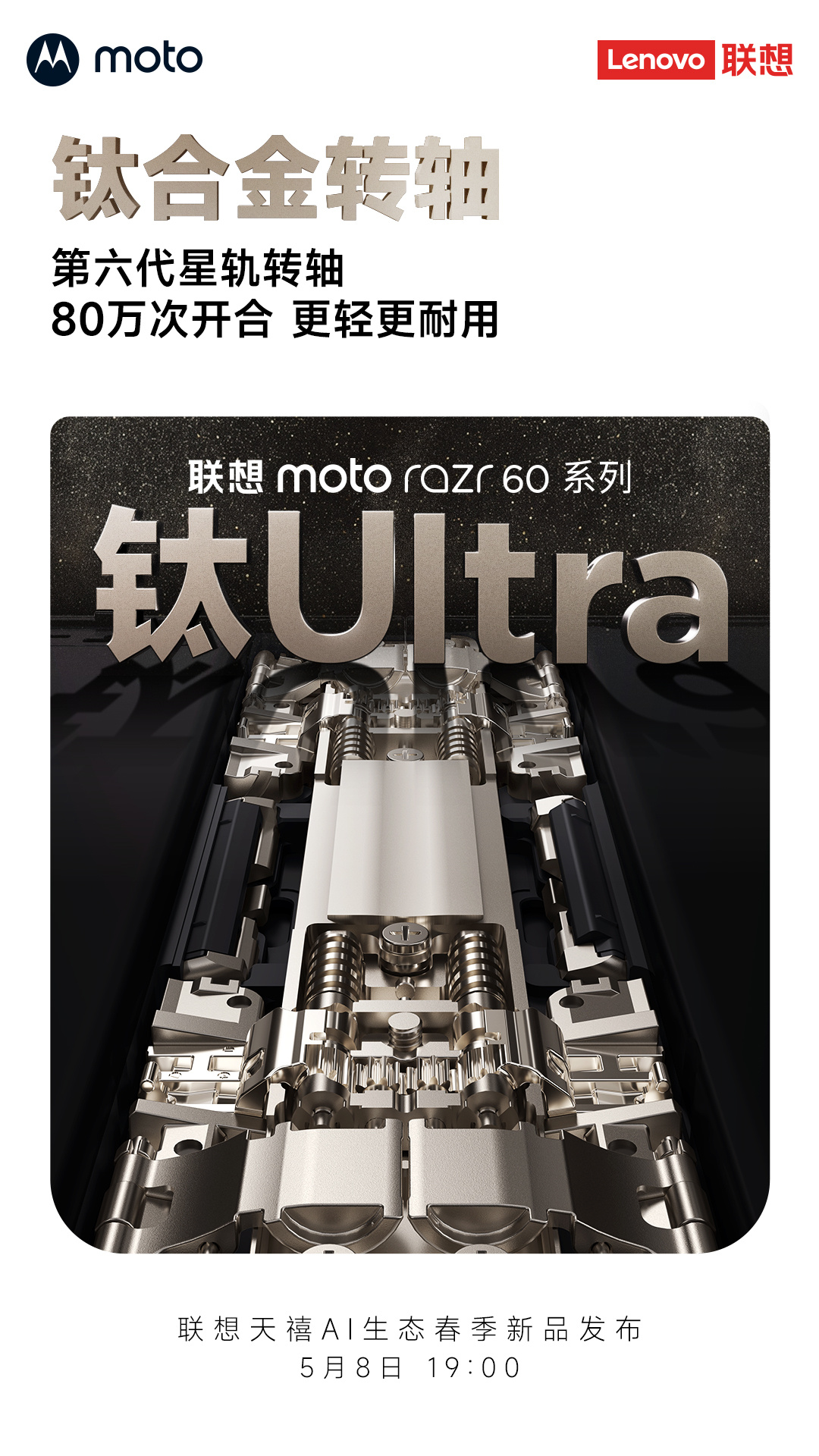 文章来源于互联网:IT之家-联想 moto razr 60 系列手机预热:全系标配钛合金转轴,5 月 8 日发布