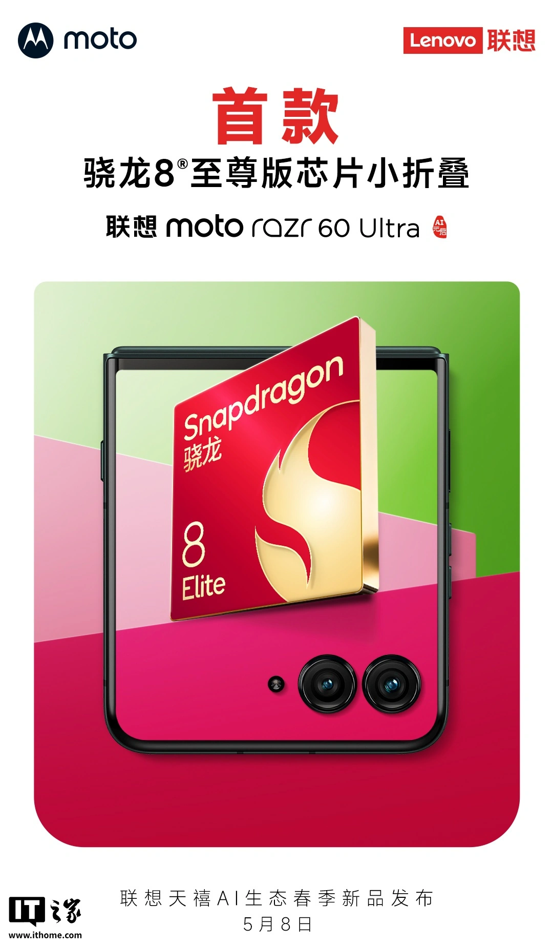 IT之家 5 月 1 日消息,联想 moto razr 60 系列手机将于 5 月 8 日发布,其中 Ultra 机型“首款搭载骁龙 8 至尊版芯片的小折叠”。