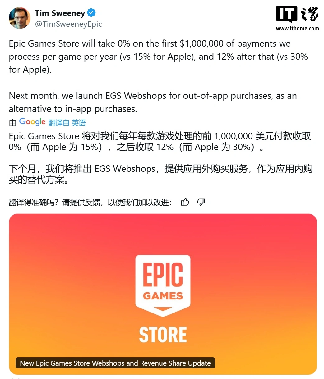 Epic 借此机会,不仅推出 Webshops,还计划在 6 月调整 Epic Games Store 支付政策:开发者每款应用每年收入超过 100 万美元之前免收佣金,之后按 88%(开发者)与 12%(Epic)的比例分成。Epic 明确表示,此政策适用于欧盟和美国等允许此做法的地区,直接挑战苹果的支付规则。