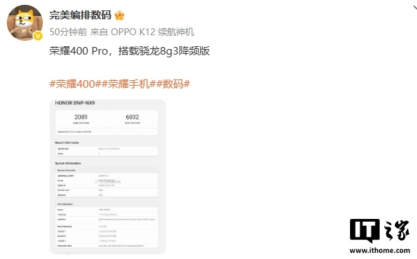IT之家 5 月 2 日消息,一款型号为 HONOR DNP-NX9 的荣耀新机昨日现身 Geekbench 跑分平台,博主 @完美编排数码 透露该机为荣耀 400 Pro,搭载骁龙 8 Gen3 降频版处理器。