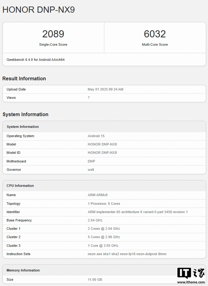 这款新机在 Geekbench 6.4.0 版本的成绩为单核 2089 分、多核 6032 分,CPU 架构为 1 Core @ 3.05 GHz+5 Cores @ 2.96 GHz+2 Cores @ 2.04 GHz。