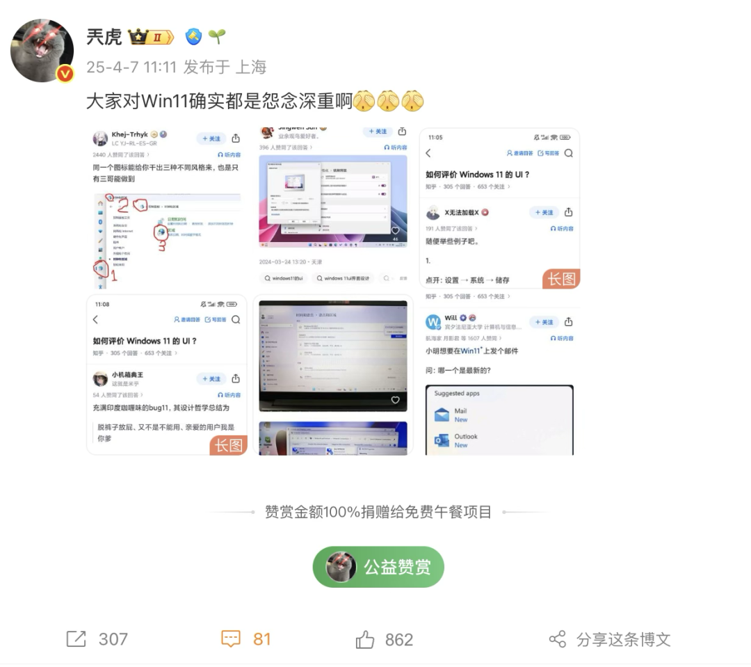 这个问题的评论区还被转发到了各大平台。有人把它发到微博,说大家对 Win11 确实怨念深重。