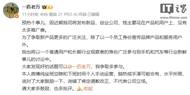 IT之家 5 月 5 日消息,星纪魅族集团市场品牌部总经理万志强昨晚发文称,因近期公司将发布新品,创业公司,钱主要花在产品和用户上,没有太多推广费。