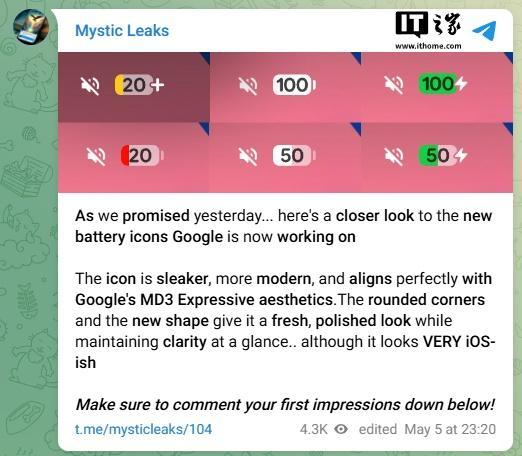 新版电池图标设计隶属于 Material 3 Expressive 界面改版计划,预计将会在即将到来的 Google I/O 大会(IT之家注:5 月 20 日至 21 日举行)上正式亮相。