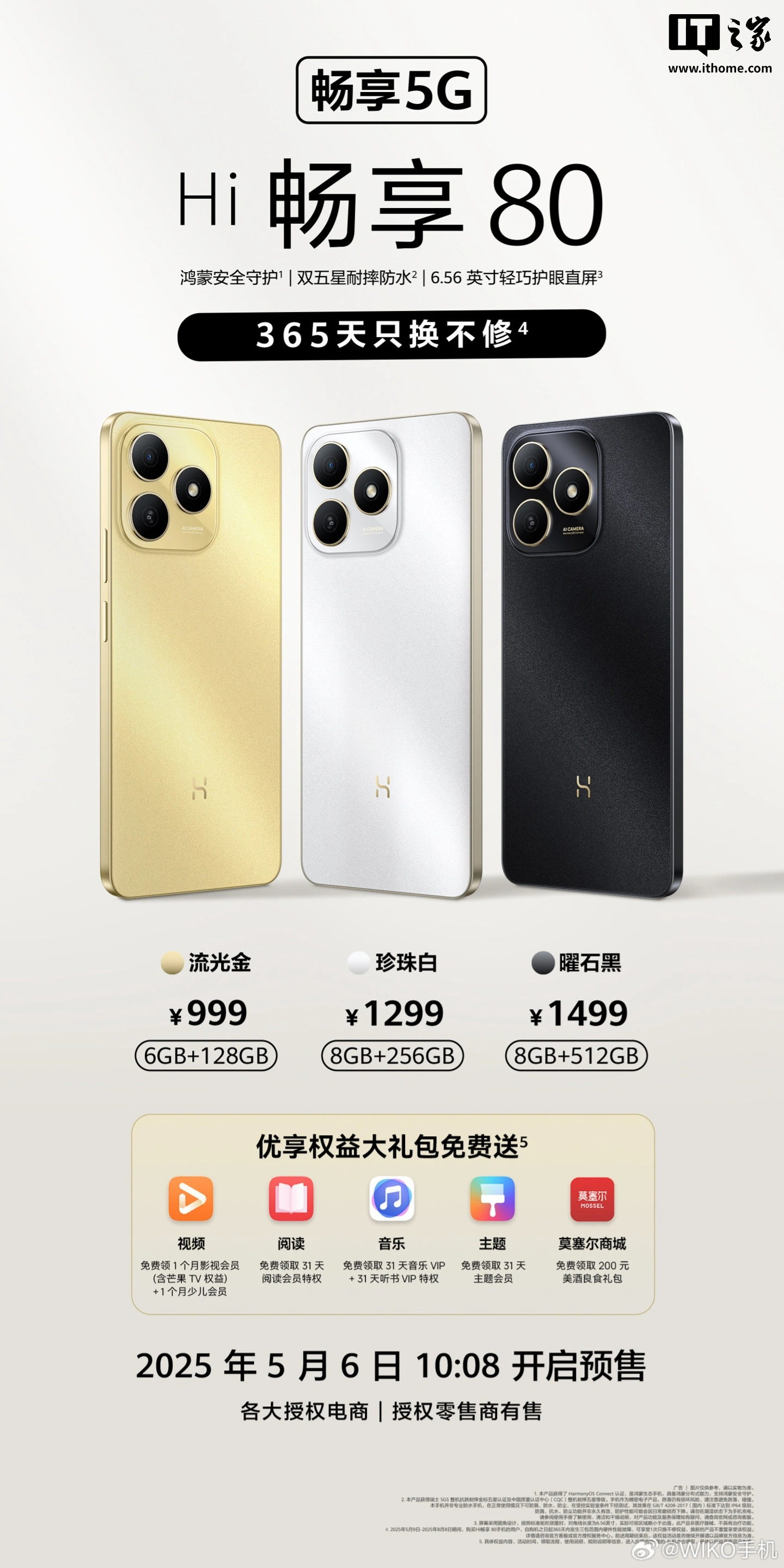 IT之家 5 月 6 日消息,WIKO Hi 畅享 80 手机今日正式发布,新机内置 5000mAh 电池、配备 6.56 英寸 LCD 直屏,建议零售价 999 元起、国补价 849.15 元起。