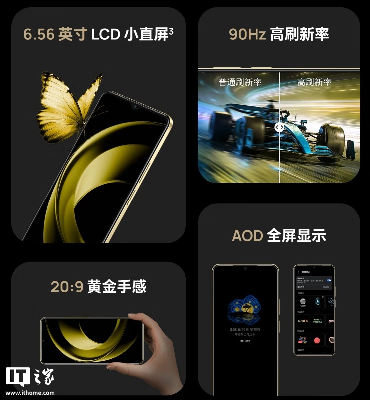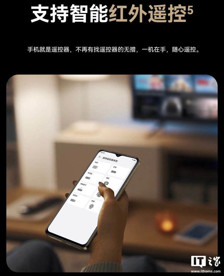 IT之家注意到,新机拥有流光金、珍珠白、曜石黑三种配色,比例为 20:9,内置 5000mAh 电池,支持 IP64 级生活防水 + 湿手触控、智能红外遥控等。