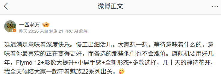 IT之家 5 月 6 日消息,星纪魅族集团市场品牌部总经理万志强 @一匹老万 昨日发文透露了星纪魅族 22 系列手机部分特性。据称,新机将预装 Flyme 12 系统、采用小屏手感 + 全新形态设计,号称“影像大提升”。