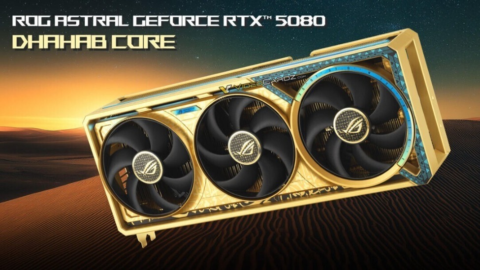 这款显卡的散热器铝制鳍片、合金护罩、风扇轮毂盖及铜质热管均采用哑光金色涂层(非电镀工艺)以蓝宝石蓝色金属质感取代传统镀铬装饰,形成鲜明撞色效果融入东方美学元素,黑色基底搭配鎏金书法体ROG标”Dhahab Core”命名中的”Core”或暗示该卡作为Dhahab系列入门型号,RTX 5080将成为用户接触该高端子品牌的首选切入点