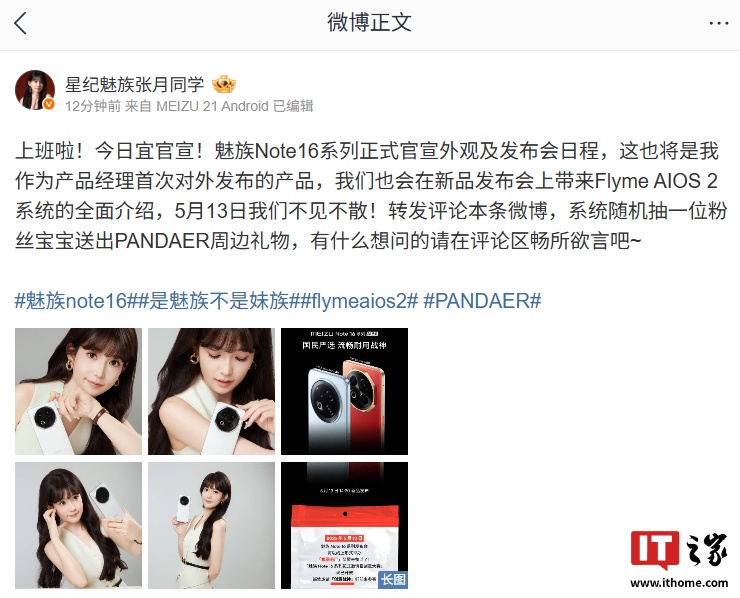 IT之家 5 月 6 日消息,魅族 Note 16 系列・国民严选暨 FlymeAIOS 生态发布会今日官宣定档 5 月 13 日 14:30 全网直播。届时将带来星纪魅族 Note 16 系列 AI 手机、Flyme AIOS 2 系统(Flyme 12)。