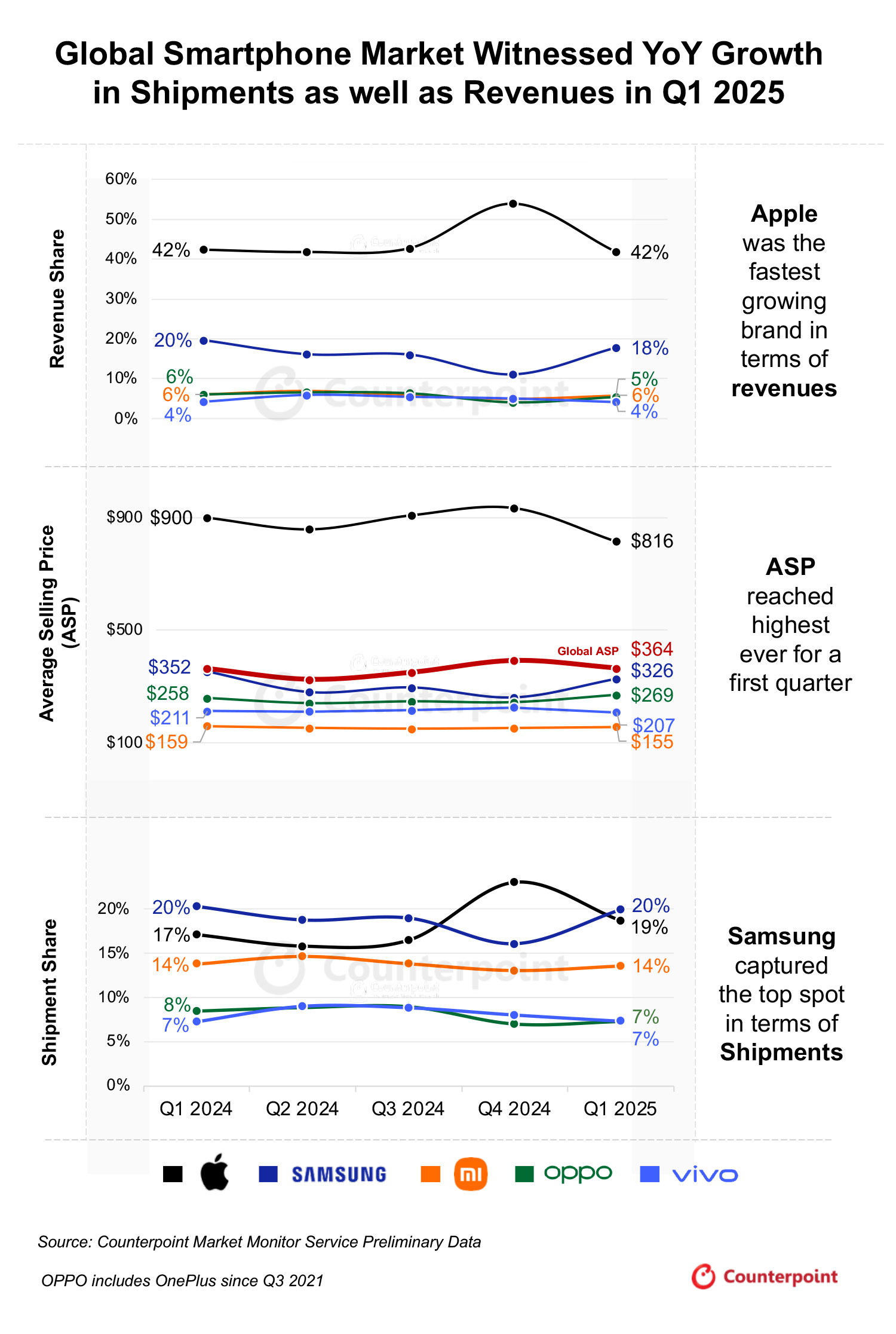 CounterPoint 报告 2025Q1 全球手机出货额:TOP5 中苹果增长最快