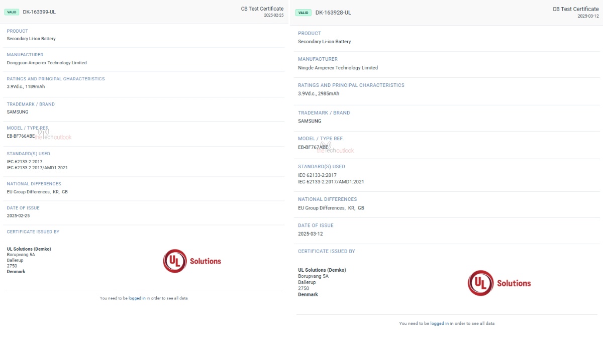 科技媒体 The Tech Outlook 在 UL Demko 认证平台发现了一组疑似三星 Galaxy Z Fold7 / Flip7 的电池规格信息。信息显示,Galaxy Z Fold7 配备的两块电池型号分别为“EB-BF966ABE”和“EB-BF967ABE”,容量分别为 2126mAh 和 2146mAh,合计 4272mAh(官方标称 4400mAh)。
