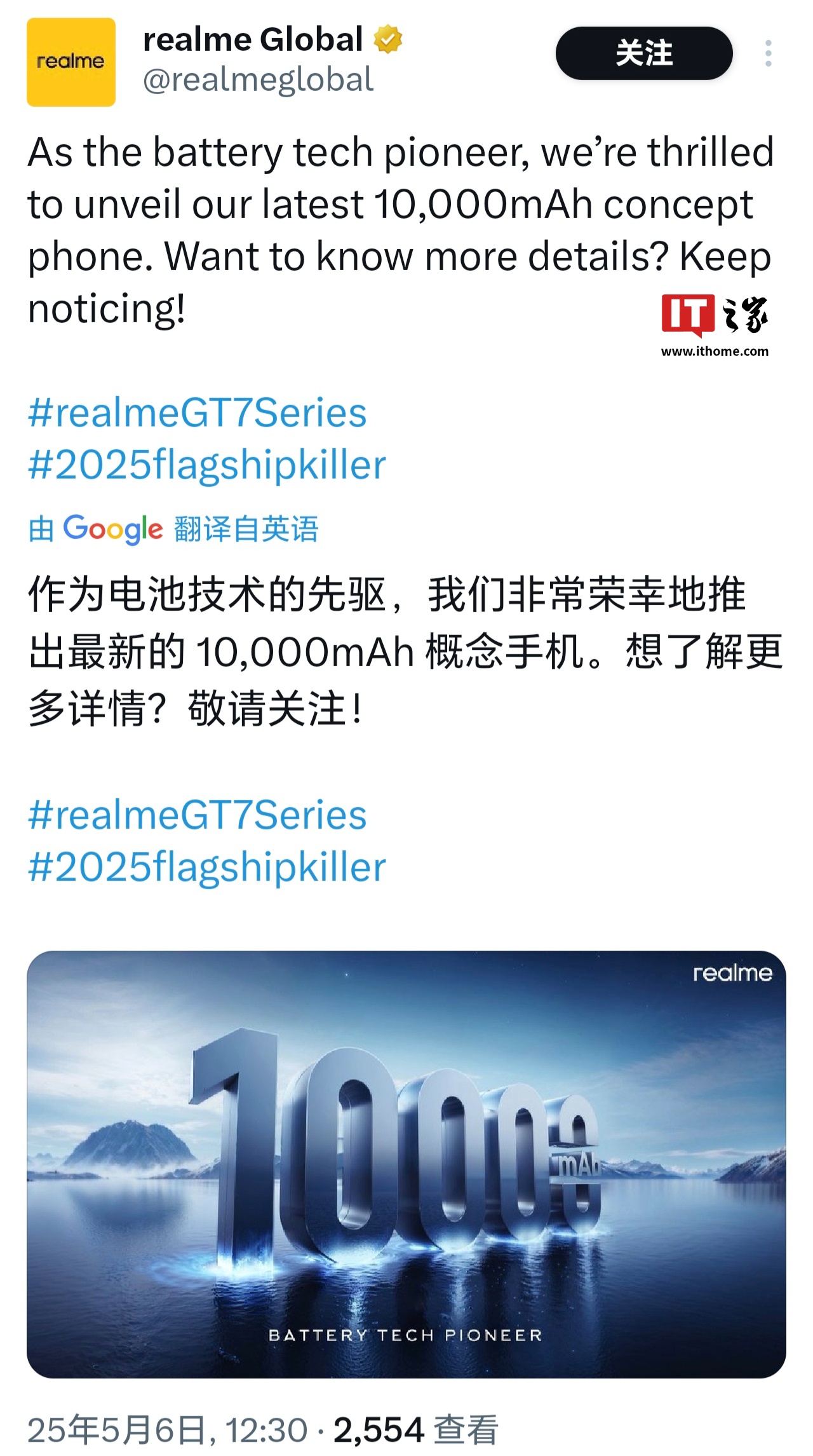 IT之家 5 月 6 日消息,realme 真我官方今日在海外官宣了一款概念手机,该机的电池容量达到了 10000mAh。