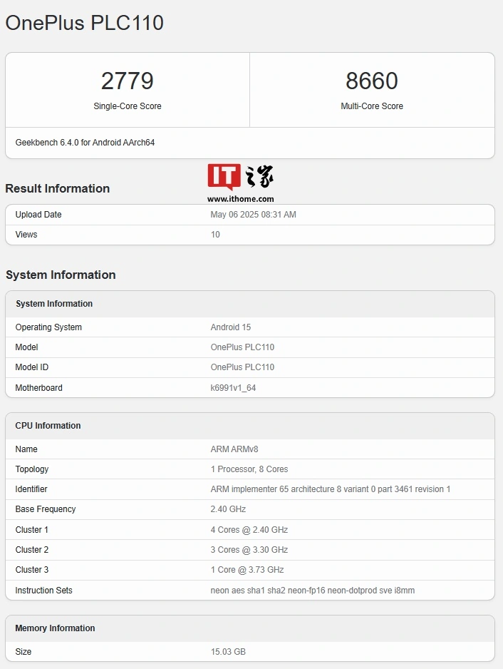 IT之家 5 月 7 日消息,科技媒体 91Mobile 昨日(5 月 6 日)发布博文,报道称型号为 PLC110 的一加手机现身 GeekBench 跑分库,预计仅在中国市场发售,会叫做一加 Ace 5 Supreme Edition,配联发科天玑 9400+ 芯片。