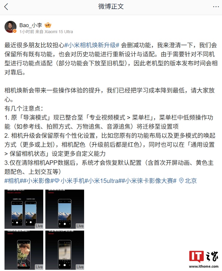 IT之家 5 月 7 日消息,有用户担心小米焕新极简相机会删减功能,小米相机部的产品经理 @Bao_小李 今日发文澄清:“会保留所有既有功能,也会对历史功能进行重新设计与适配。”