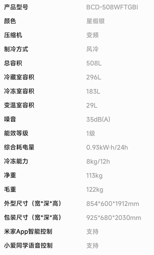 此外,该产品采用变频压缩机和变频风机,搭配 6 枚感温探头;360° 风冷循环制冷,快速均匀免除霜;一级能效更省电,0.93 度 / 天、35 分贝,压缩机 10 年质保;支持小米澎湃智联,接入米家 App,支持超级小爱控制。