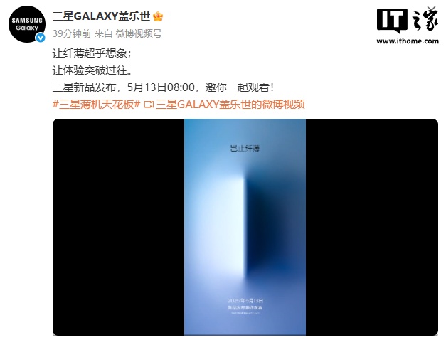 IT之家 5 月 8 日消息,三星今日官宣将于 5 月 13 日 8:00 举行新品发布会,“让纤薄超乎想象;让体验突破过往。”从官方 slogan 来看,本次发布会预计将带来超薄旗舰新机 Galaxy S25 Edge。