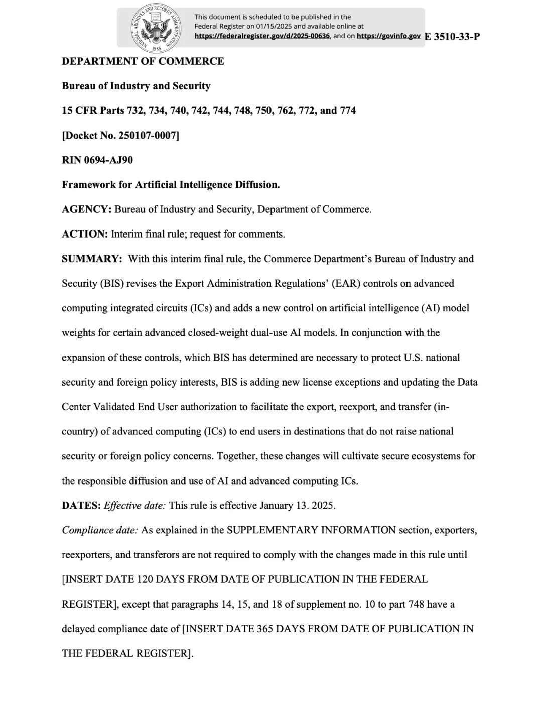 1月13日,美国政府发布了长达168页的《人工智能扩散暂行最终规则》,在文件中表示,将进一步限制AI芯片和技术出口,将全世界的先进计算能力保留在美国及盟友手中,同时寻找更多的方法阻止中国获取先进算力。