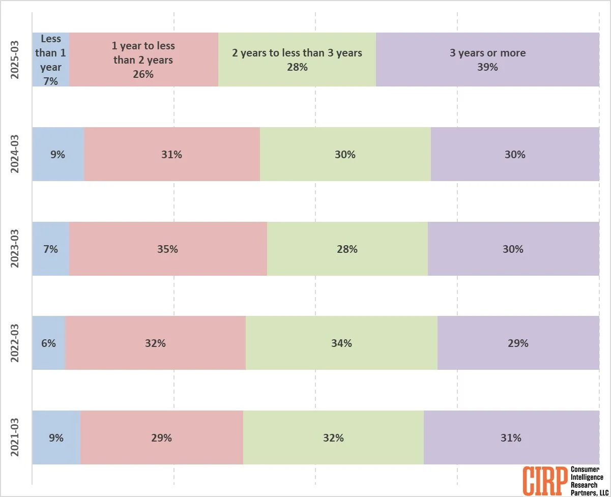CIRP 数据显示,2025 年第 1 季度,美国 39% 的 iPhone 买家更换了至少使用三年的旧设备,较过去几年同期的 30% 明显上升。IT之家附上截图如下: