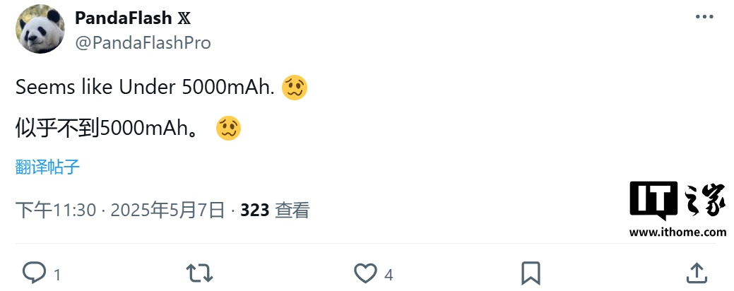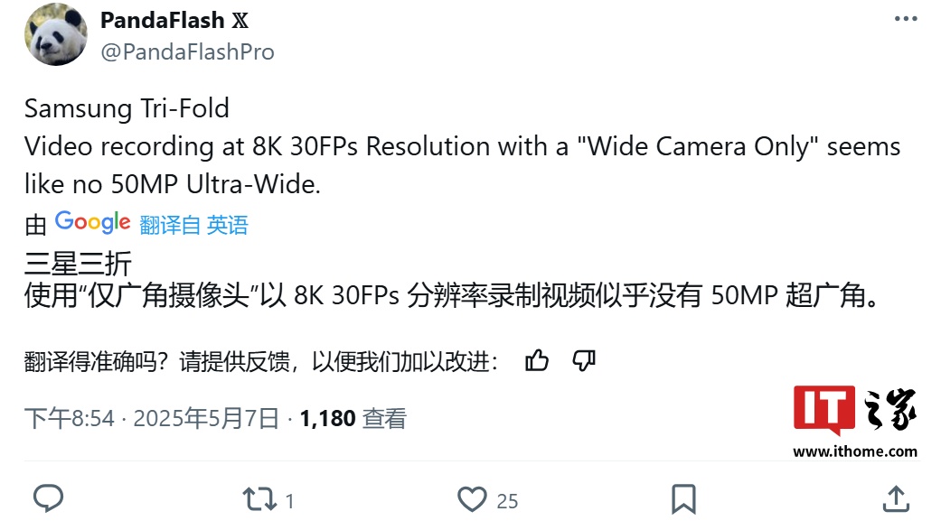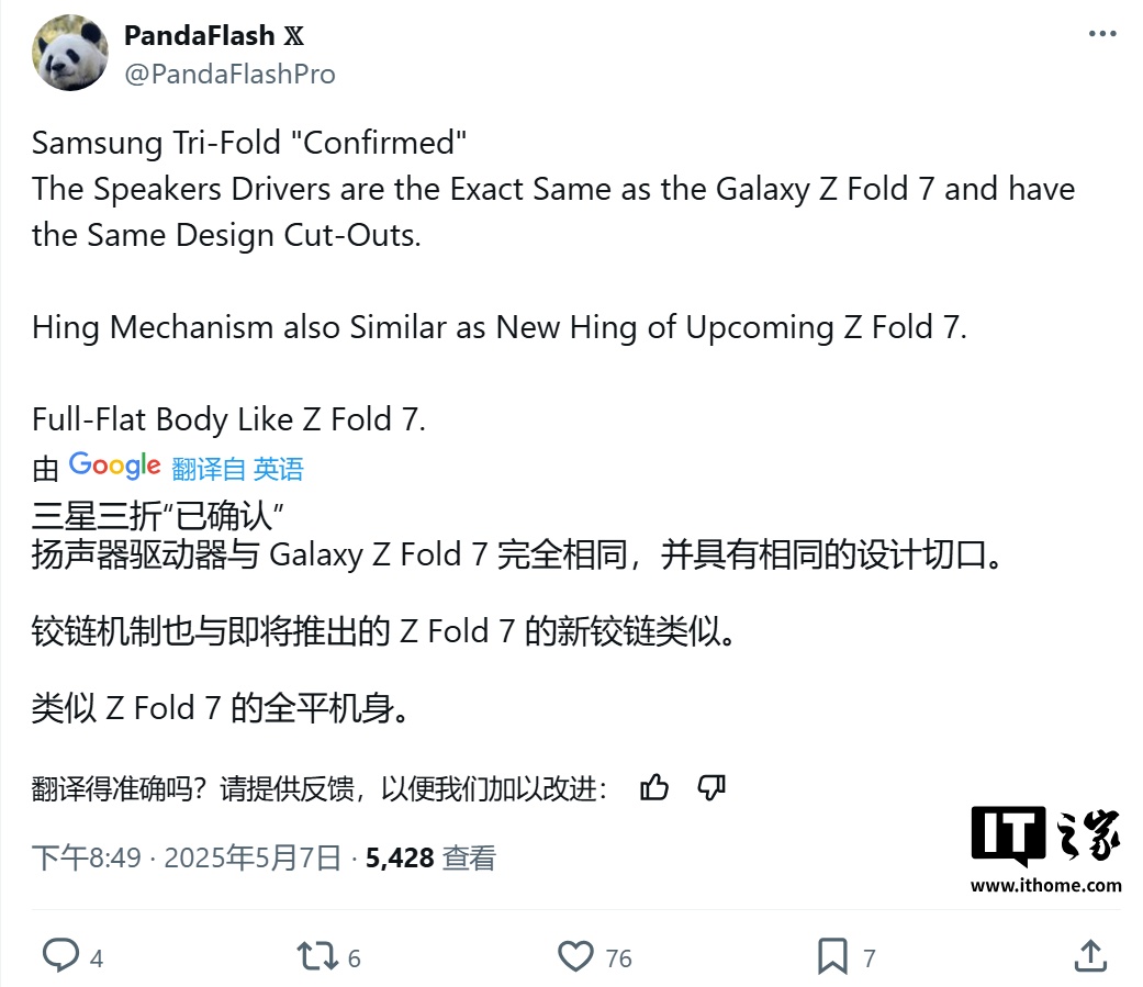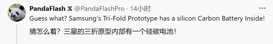 IT之家 5 月 8 日消息,消息源 @PandaFlashPro 昨日(5 月 7 日)在 X 平台曝料,称三星首款三折叠手机名为 G Fold,搭载硅碳电池(silicon-carbon battery),容量可能低于 5000mAh。