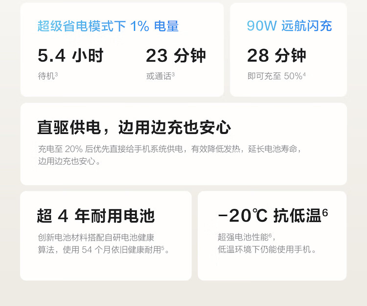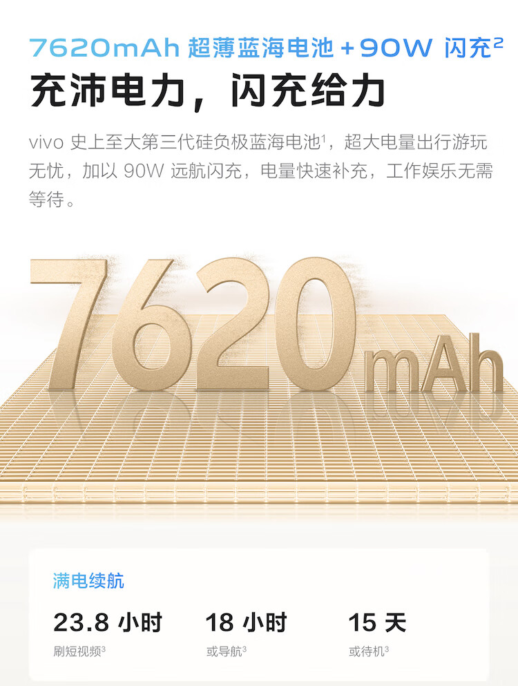 该机采用了 vivo 史上最大 7620mAh 超薄蓝海电池 + 90W 远航闪充,可实现 54 个月耐用电池健康,还支持直驱供电续航技术,边充边玩时能直接绕过电池给主板供电,减少充放电时候的大量发热。