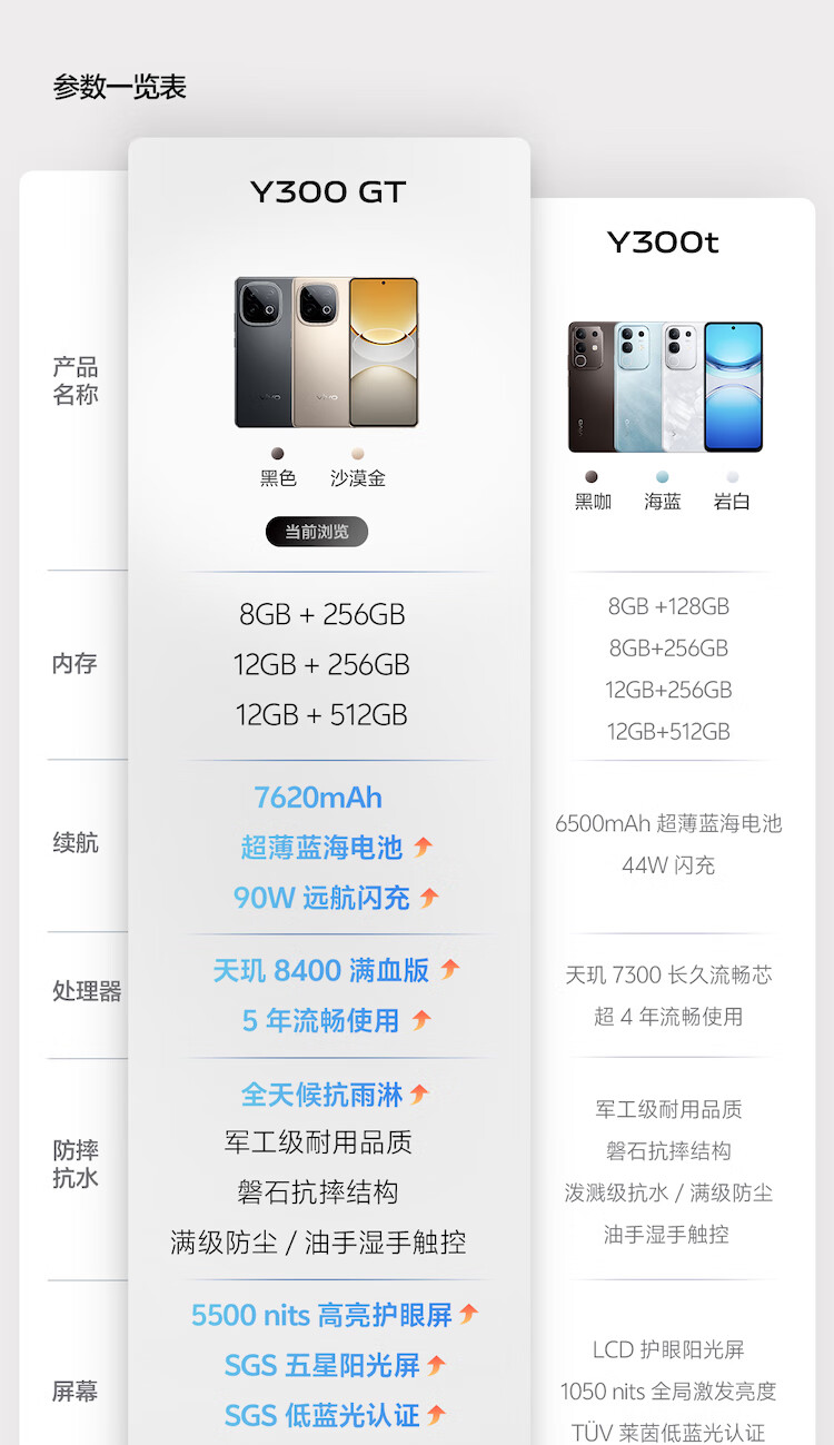 IT之家 5 月 9 日消息,vivo Y300 GT 手机今日正式上市,搭载联发科天玑 8400 满血版、7620mAh 超薄蓝海电池,提供沙漠金、黑色以及三个存储版本可选: