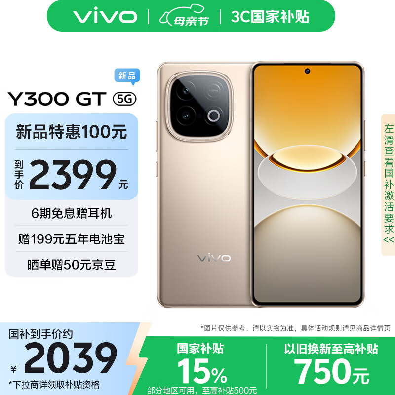 京东 vivo Y300 GT 手机 12GB+512GB 沙漠金 7620mAh 超薄蓝海电池 天玑 8400 满血版 2399 元直达链接