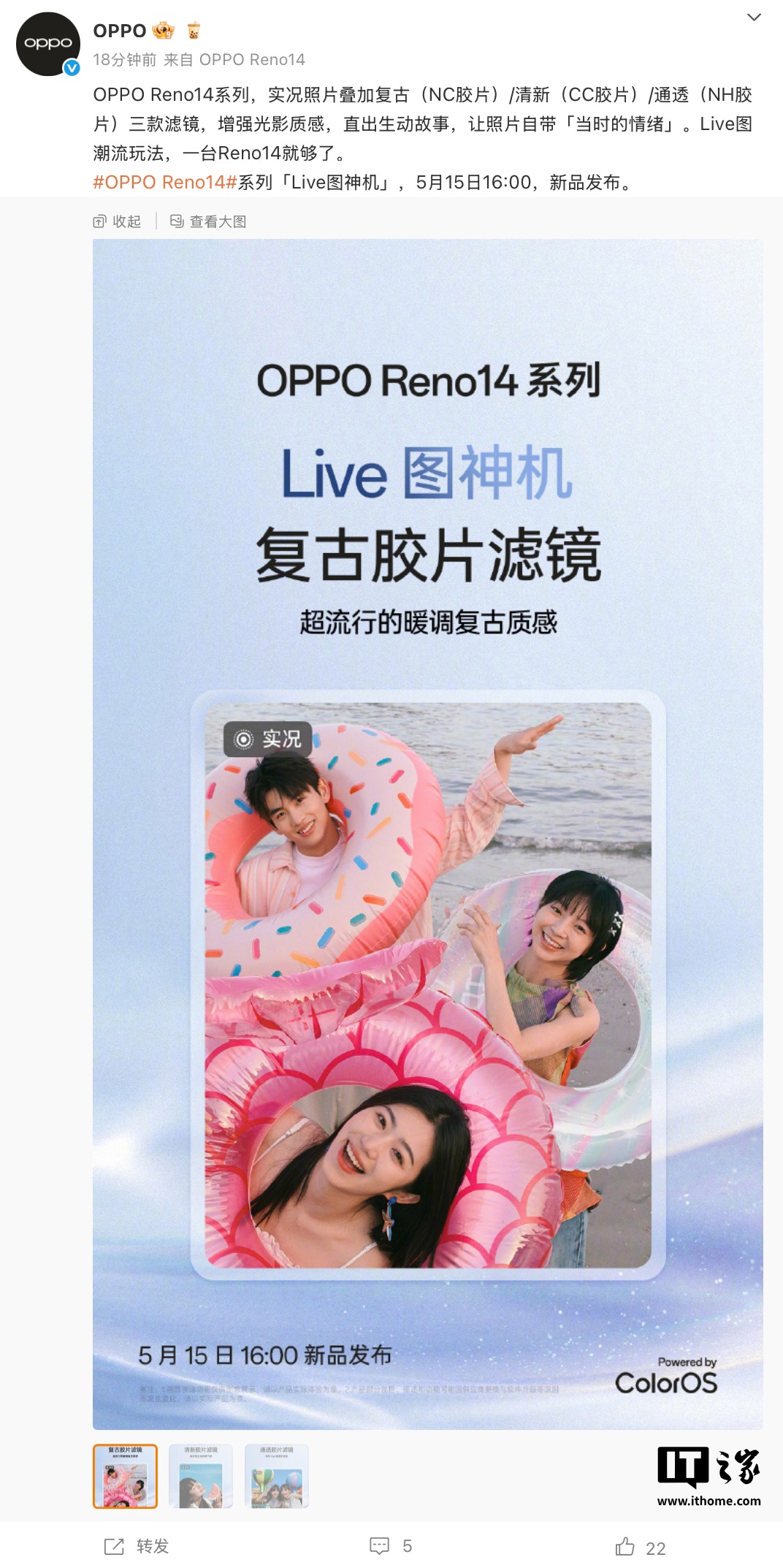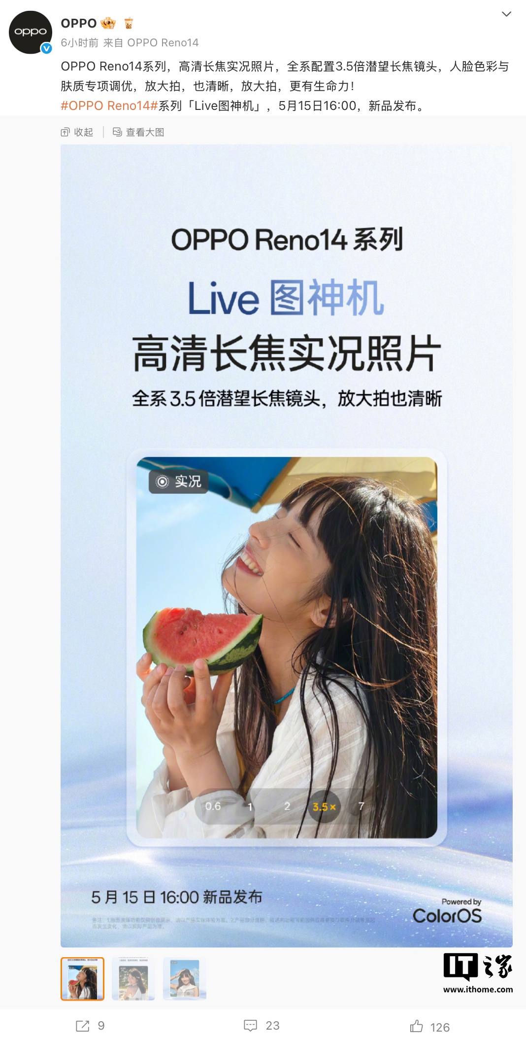 IT之家 5 月 9 日消息,OPPO Reno14 系列将于 5 月 15 日 16:00 发布,官方今天发文预热系列手机标配 3.5 倍潜望长焦镜头,号称针对人脸色彩和肤质进行专项调优,同时支持“高清长焦实况照片”。