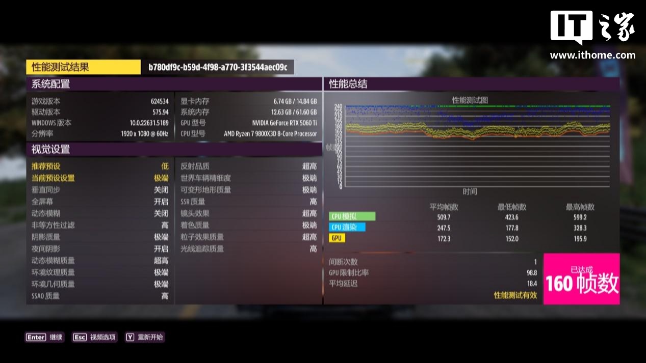RTX 5060 Ti 在 1080P 分辨率 + 极端画质下,游戏平均帧数 160 帧,1% Low 帧 133 帧;