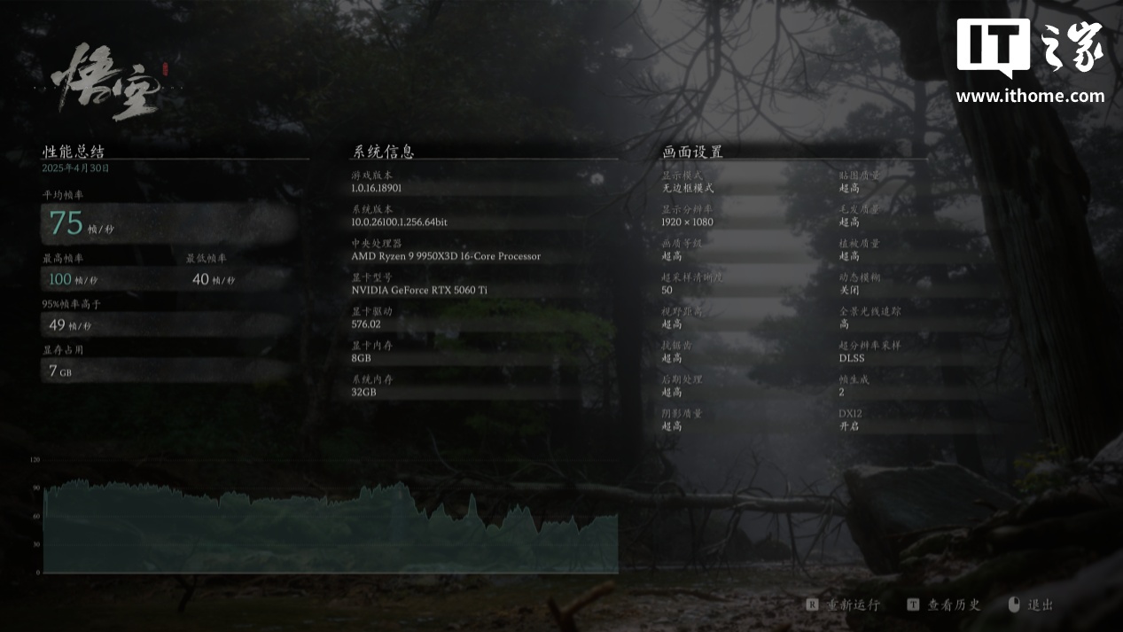 RTX 4060 Ti 在 1080P 分辨率 + 极端画质下,游戏平均帧数 118 帧,1% Low 帧 75 帧;