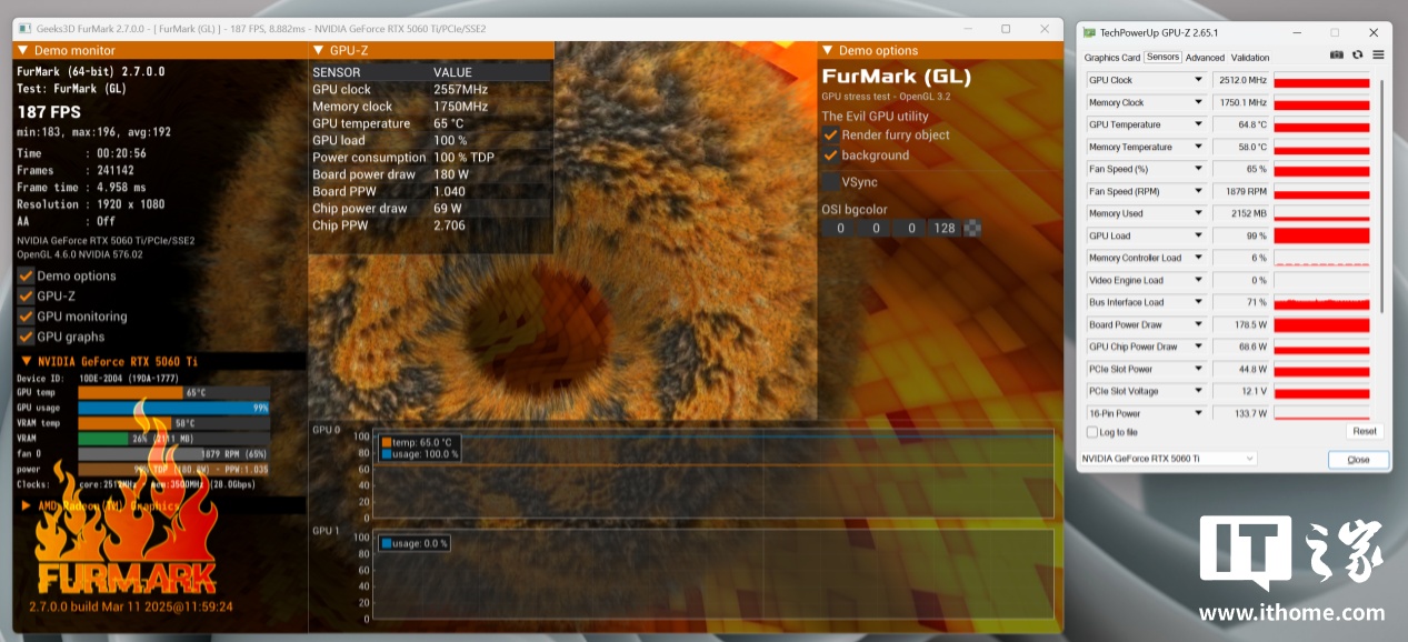 经过 20 分钟的 FurMark 烤机,索泰 GeForce RTX 5060 Ti 8GB 月白 OC 显卡的 GPU 功耗温度在 180W 左右,GPU 主频达到了 2512MHz。在温度表现上,GPU 核心温度为 64.8℃,显存温度为 58℃,基本和上一代 RTX 4060 Ti 显卡旗鼓相当。