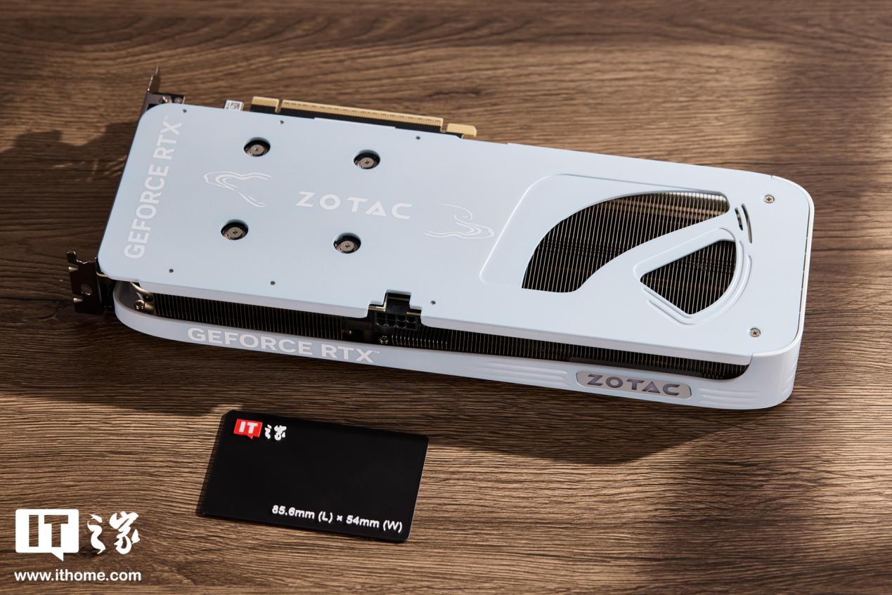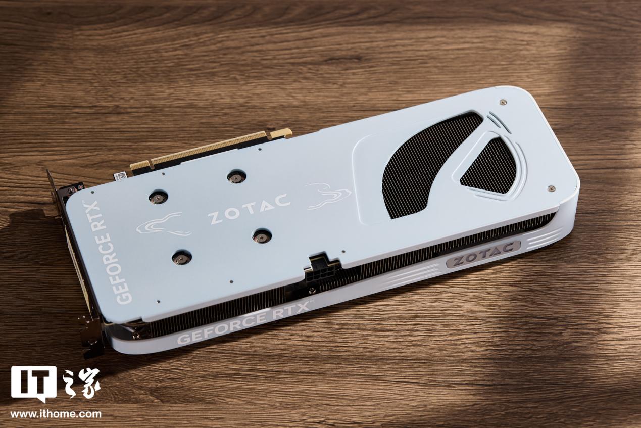 显卡金属背板也采用了月白色涂装,整个装甲和背板的四角都做了非常圆润的处理,螺丝挖孔小且排列规整,甚至连背板散热开口的造型看起来都比较柔美,足见索泰在“月白”系列外观上花了不少功夫。