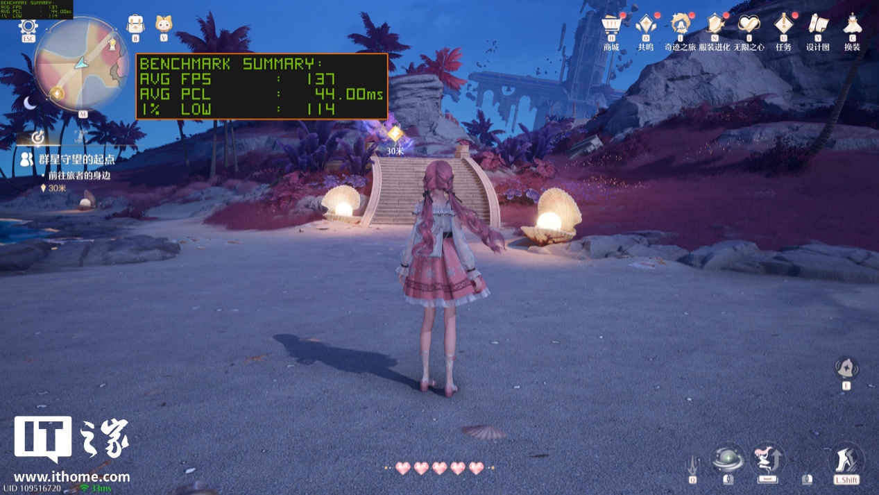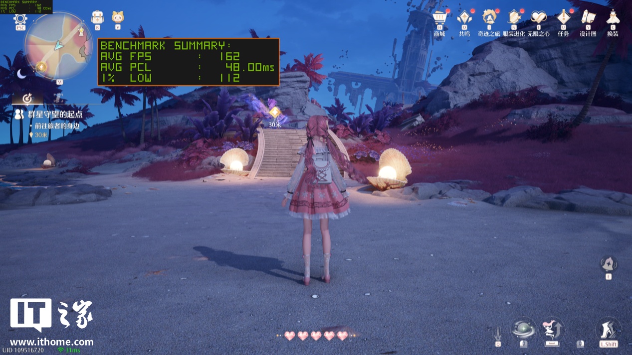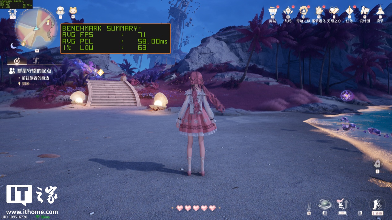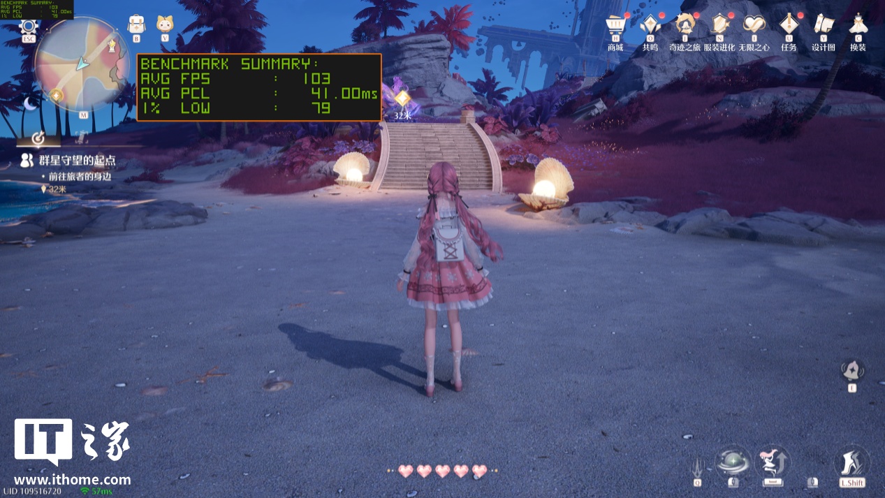 《无限暖暖》在 4 月底的大版本更新中,支持了最新的 DLSS 多帧生成技术,进一步提升了游戏的性能上限。新版本的新场景“星之海”对于性能的压力明显大了不少,以 2K 分辨率 + 极致原生画质 + 光线追踪 + TSR 抗锯齿下运行,游戏平均帧数为 71 帧,1% Low 帧 63 帧,跟锁 60 帧玩起来效果差不多,更别提游戏平均延迟也增加到了 58ms。