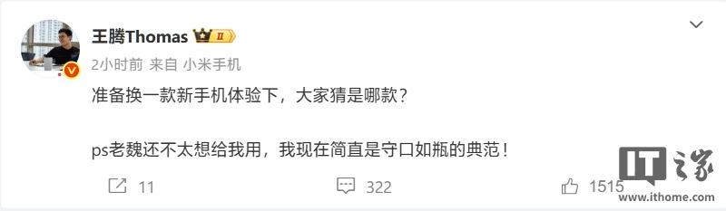 IT之家 5 月 10 日消息,小米中国区市场部总经理、REDMI 品牌总经理 @王腾Thomas 今日在微博发文称,准备“换一款新手机体验下”,并邀请网友猜测是哪款机型。与此同时,王腾微博的小尾巴也换成了“小米手机”。