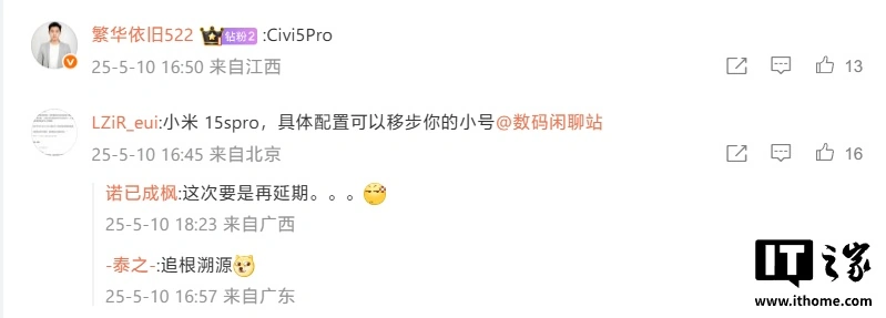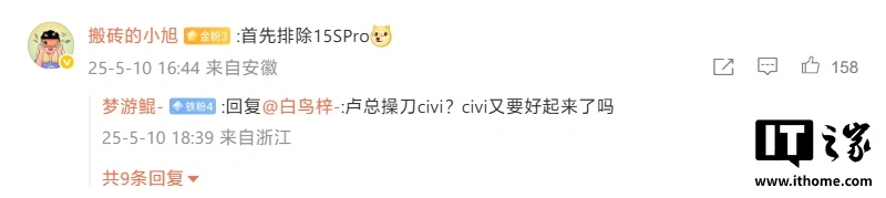 这则微博下方,网友们的讨论多涉及到 15S Pro、Civi 5 Pro 两款机型。